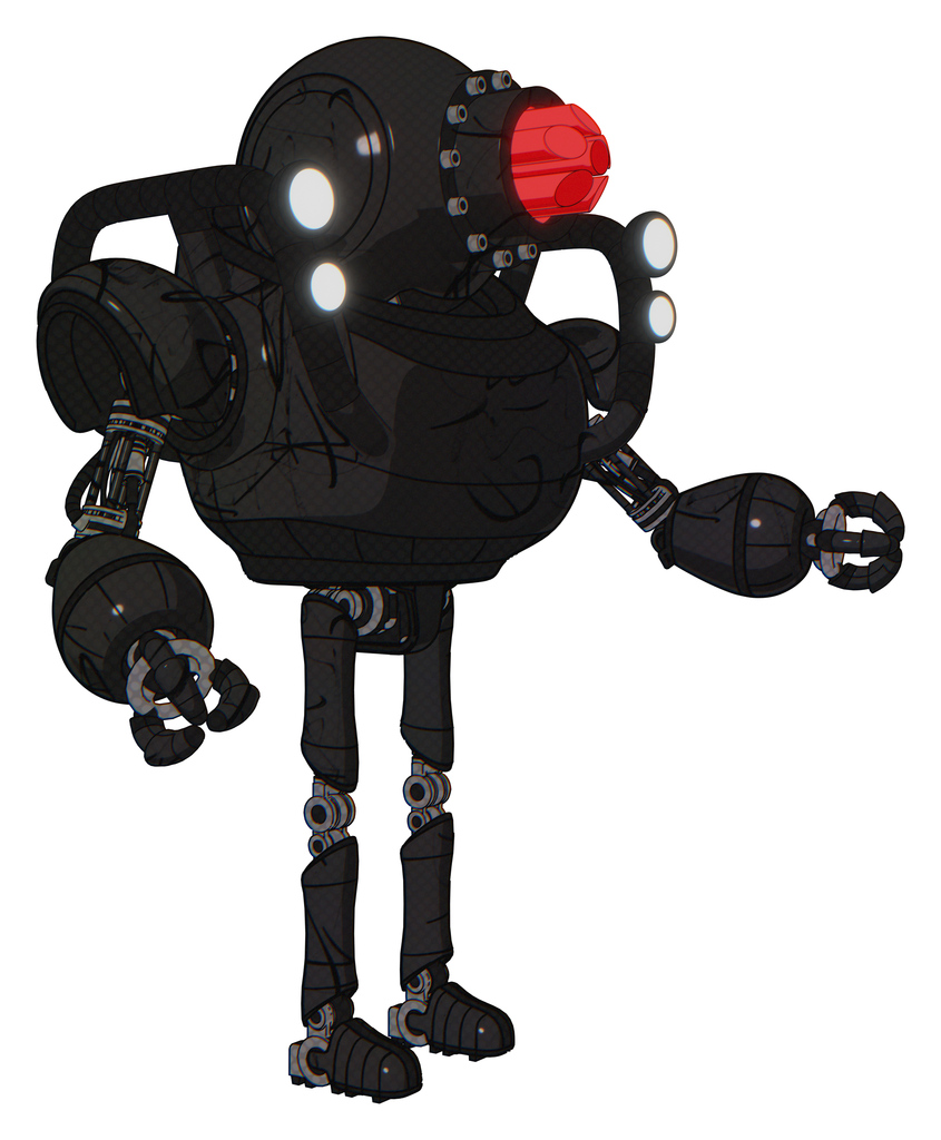 Bot containing round head and red laser crystal array and heavy upper chest and shoulder headlights and ultralight foot exosuit. Toon black scribbles sketch. Interacting.