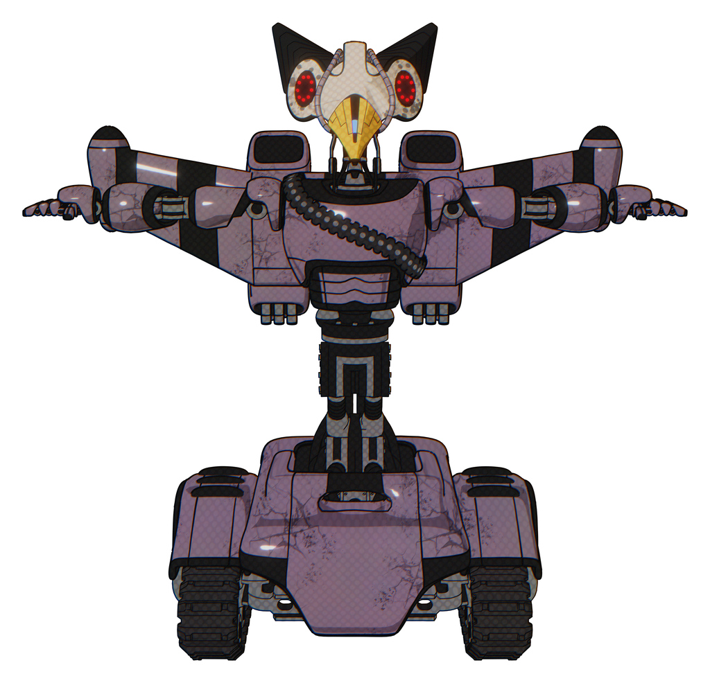Robot containing bird skull head and red led circle eyes and robobeak design and light chest exoshielding and rubber chain sash and stellar jet wing rocket pack and tank tracks. Lilac metal. T-pose.
