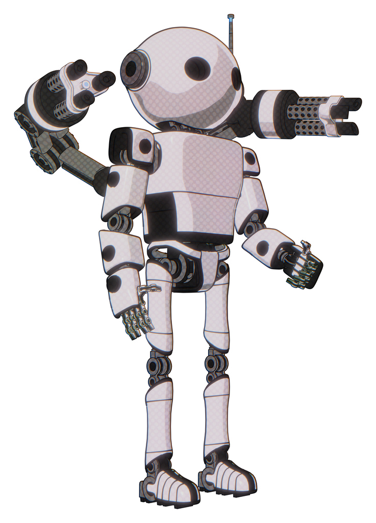 Robot containing oval wide head and retro antenna with light and light chest exoshielding and prototype exoplate chest and minigun back assembly and ultralight foot exosuit. White halftone toon.