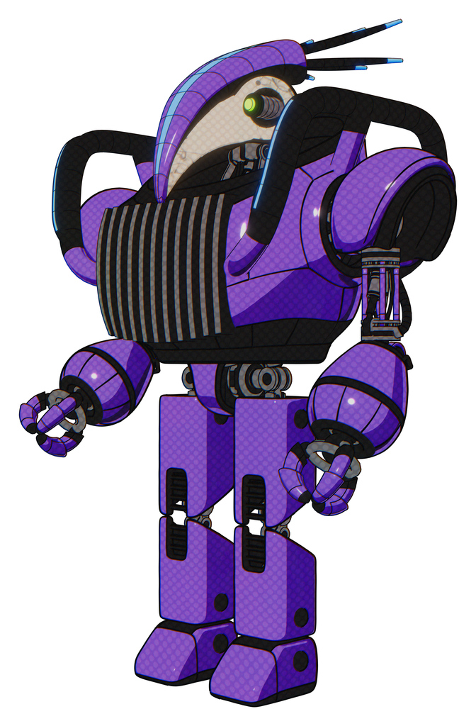 Droid containing bird skull head and yellow and green scope eyes and head shield design and heavy upper chest and chest vents and blue strip lights and prototype exoplate legs.