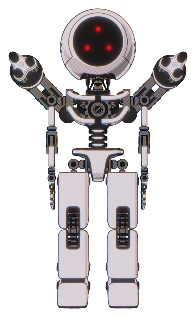 Droid containing three led eyes round head and light chest exoshielding and minigun back assembly and no chest plating and prototype exoplate legs. White halftone toon. Front view.
