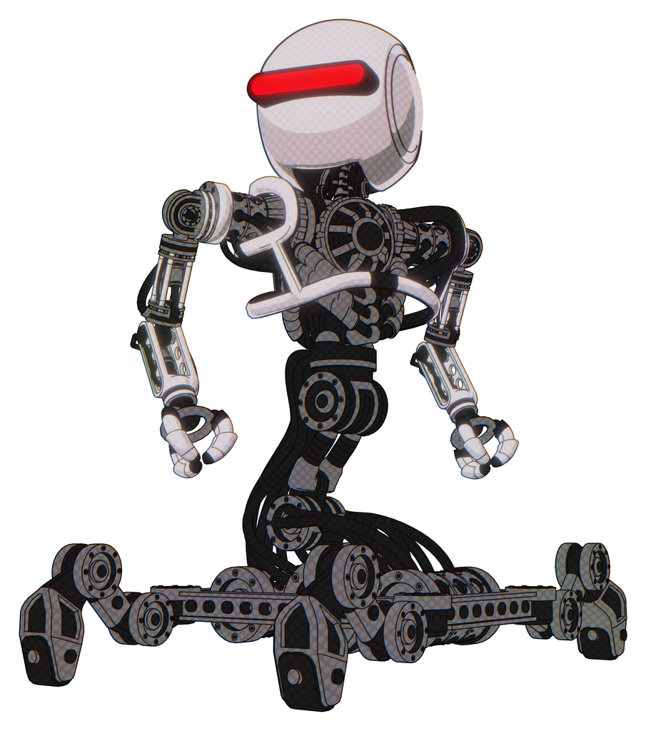 Droid containing round head and horizontal red visor and heavy upper chest and no chest plating and insect walker legs. White halftone toon. Hero pose.