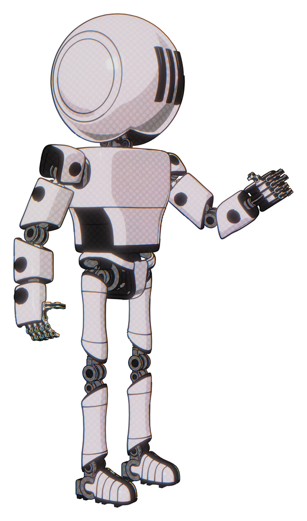 Bot containing round head and three lens sentinel visor and light chest exoshielding and prototype exoplate chest and ultralight foot exosuit. White halftone toon. Interacting.