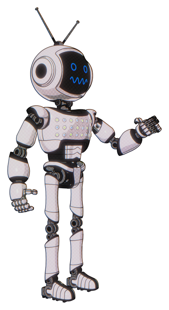 Automaton containing digital display head and stunned expression and retro antennas and light chest exoshielding and chest green blue lights array and ultralight foot exosuit. White halftone toon.