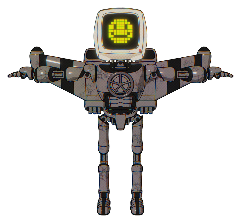 Robot containing old computer monitor and pixel design of yellow happy face and light chest exoshielding and chest valve crank and stellar jet wing rocket pack and ultralight foot exosuit.