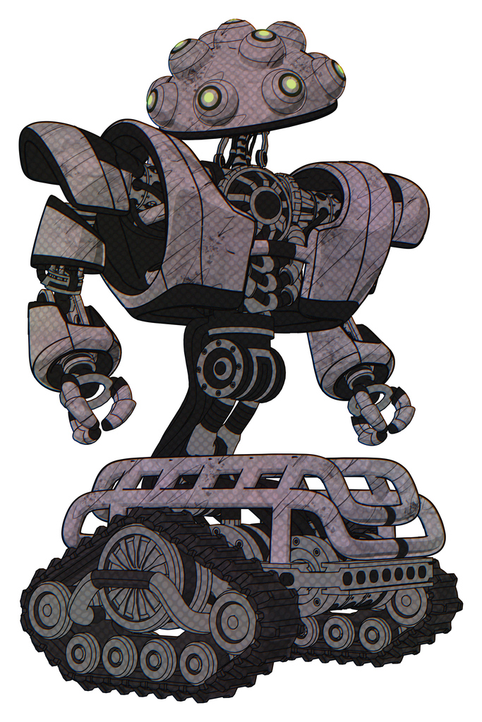 Robot containing techno multi-eyed domehead design and heavy upper chest and heavy mech chest and tank tracks. Sketch fast lines. Hero pose.