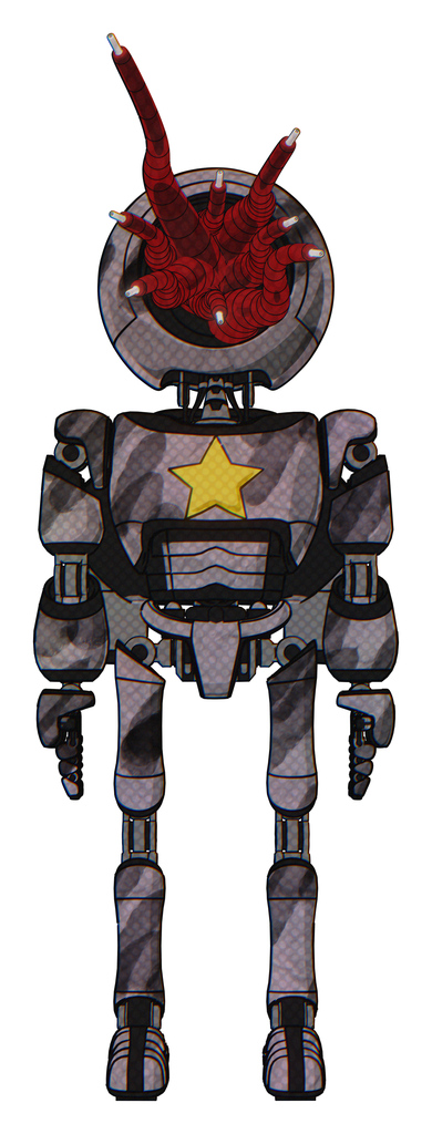 Droid containing jellyfish style head red fiber optic tentacles and light chest exoshielding and yellow star and rocket pack and ultralight foot exosuit. Sketch pad wet ink smudge. Front view.