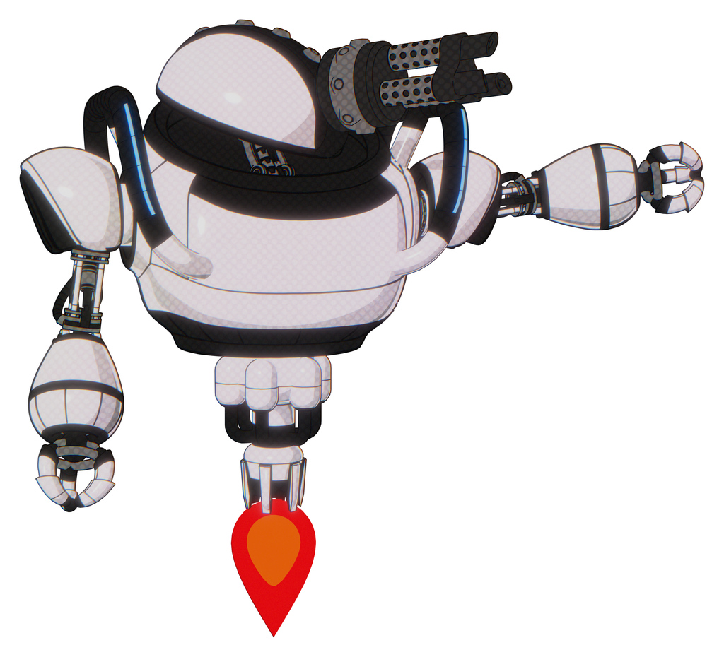 Mech containing gatling gun face design and heavy upper chest and blue strip lights and jet propulsion. White halftone toon. Pointing left or pushing a button..