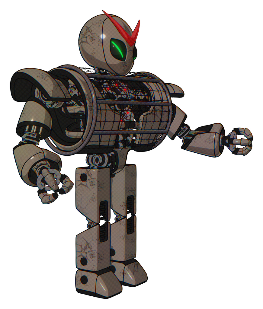 Droid containing grey alien style head and green demon eyes and heavy upper chest and heavy mech chest and barbed wire chest armor cage and prototype exoplate legs. Patent khaki metal. Interacting.