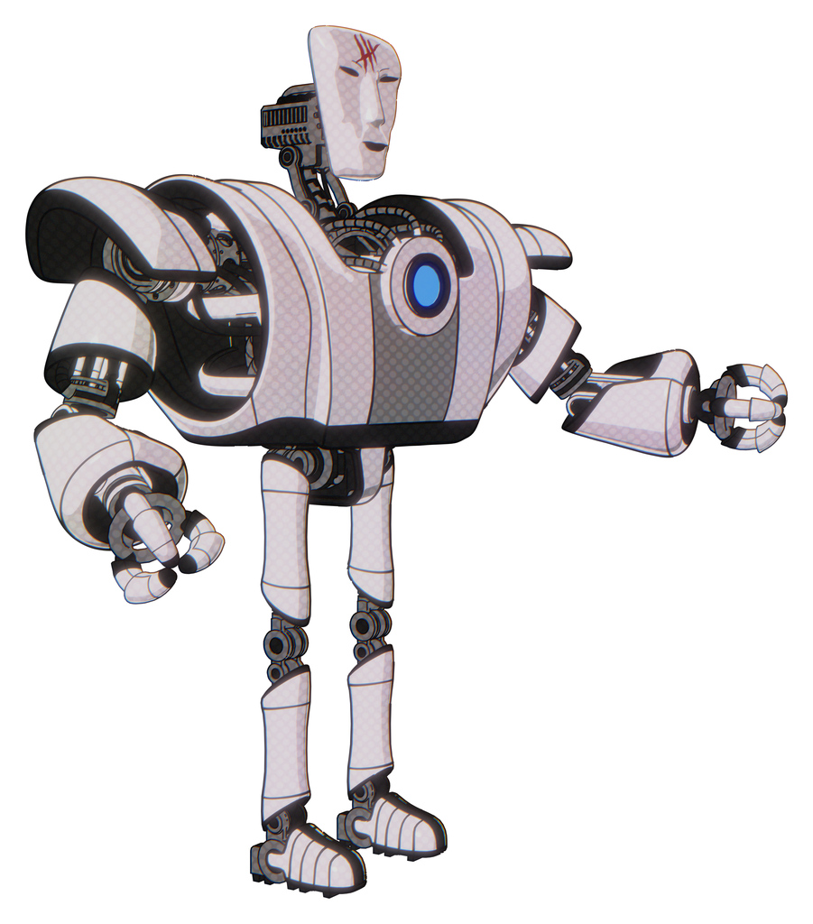 Mech containing humanoid face mask and red slashes war paint and heavy upper chest and heavy mech chest and blue energy fission element chest and ultralight foot exosuit. White halftone toon.