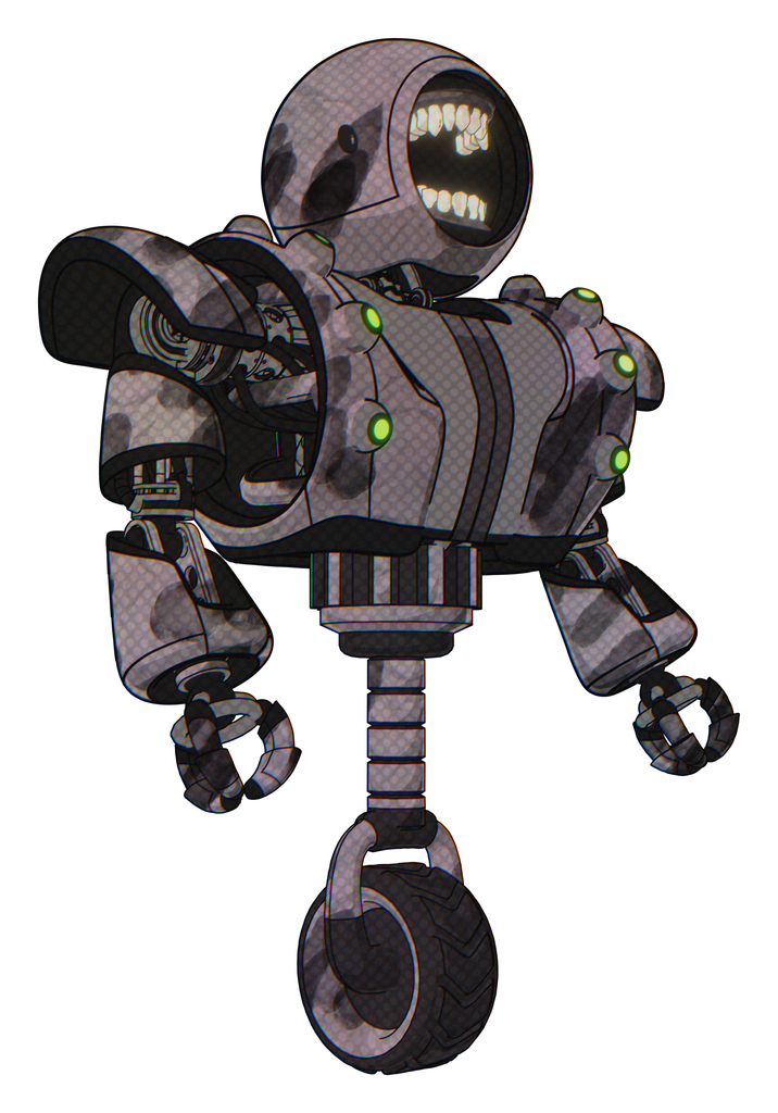 Mech containing round head chomper design and heavy upper chest and heavy mech chest and green cable sockets array and unicycle wheel. Sketch pad wet ink smudge. Facing left view.