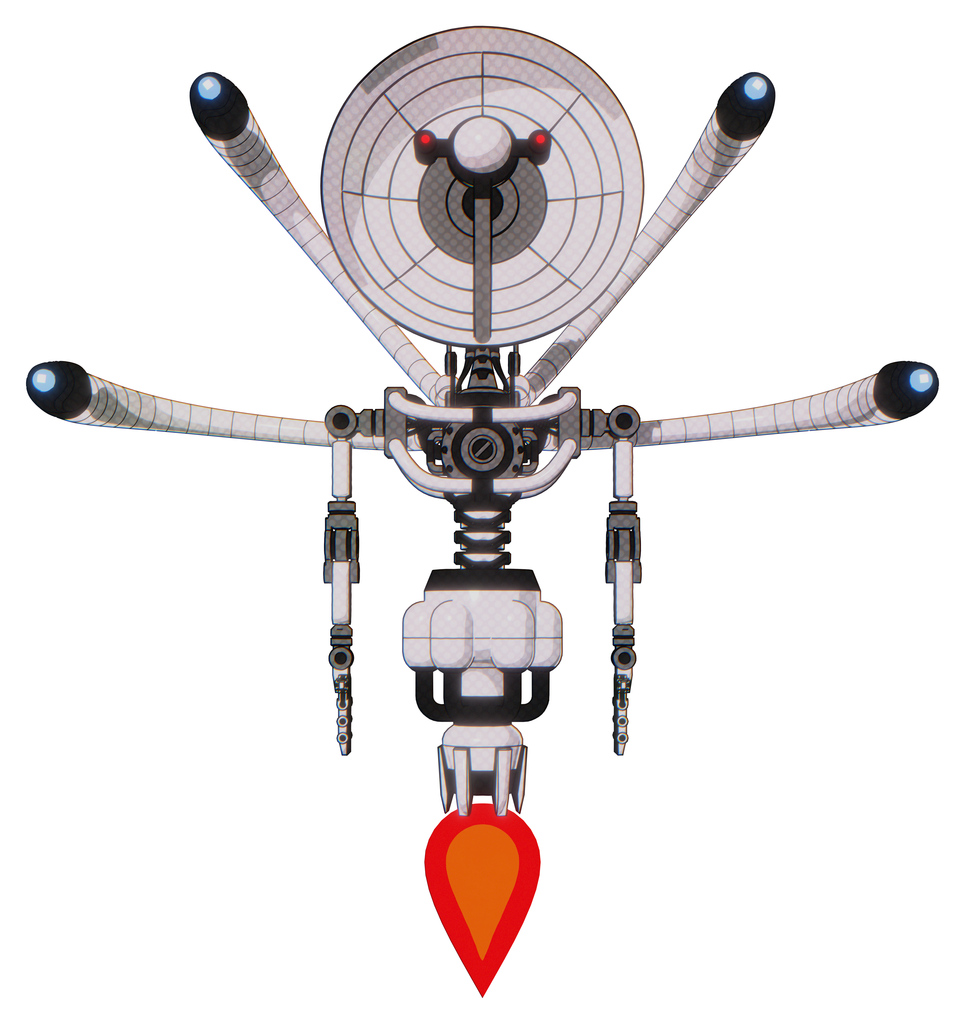 Cyborg containing dual retro camera head and satellite dish head and light chest exoshielding and blue-eye cam cable tentacles and no chest plating and jet propulsion. White halftone toon. Front view.