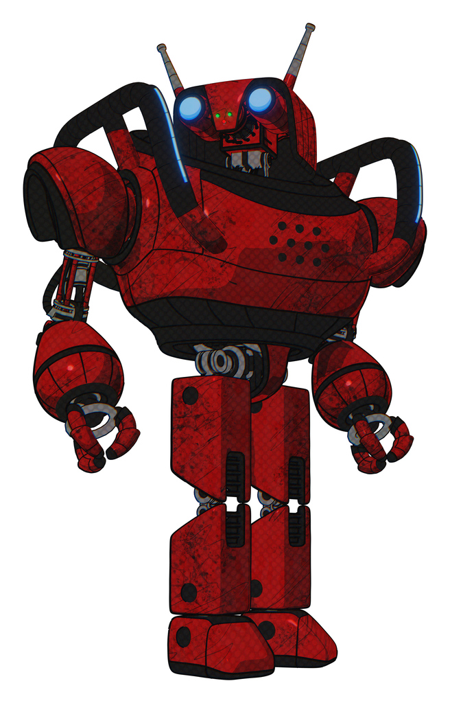 Automaton containing dual retro camera head and cyborg antenna head and heavy upper chest and blue strip lights and prototype exoplate legs. Red blood grunge material. Hero pose.