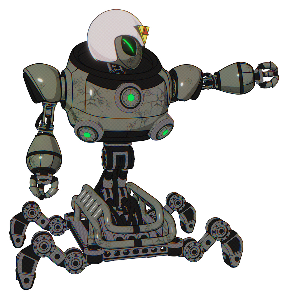 Robot containing elements: grey alien style head, green demon eyes, triangle design, helmet, heavy upper chest, chest green energy cores, insect walker legs. Material: Concrete grey metal.