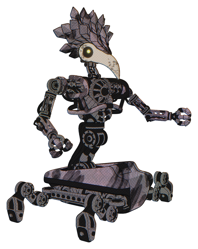 Droid containing bird skull head and yellow led protruding eyes and bird feather design and heavy upper chest and no chest plating and insect walker legs. Sketch pad wet ink smudge. Interacting.