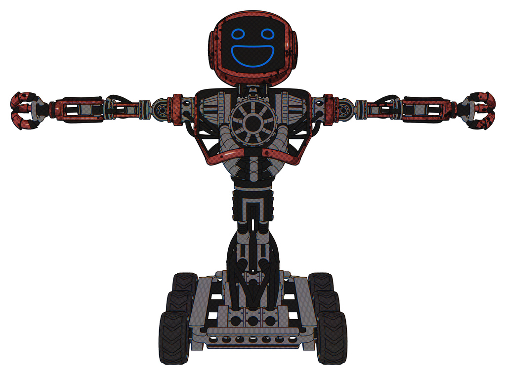Droid containing digital display head and wide smile and heavy upper chest and no chest plating and six-wheeler base. Grunge matted orange. T-pose.