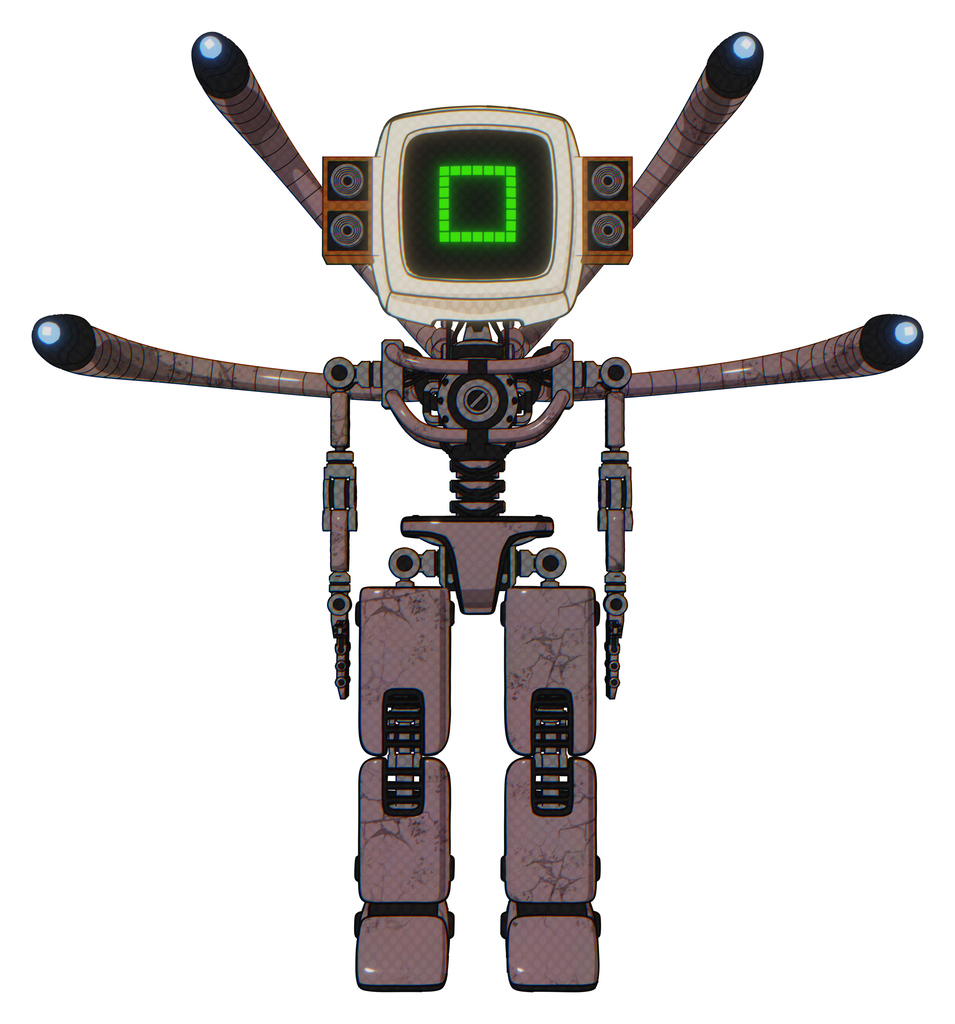 Droid containing old computer monitor and pixel square design and old retro speakers and light chest exoshielding and blue-eye cam cable tentacles and no chest plating and prototype exoplate legs.