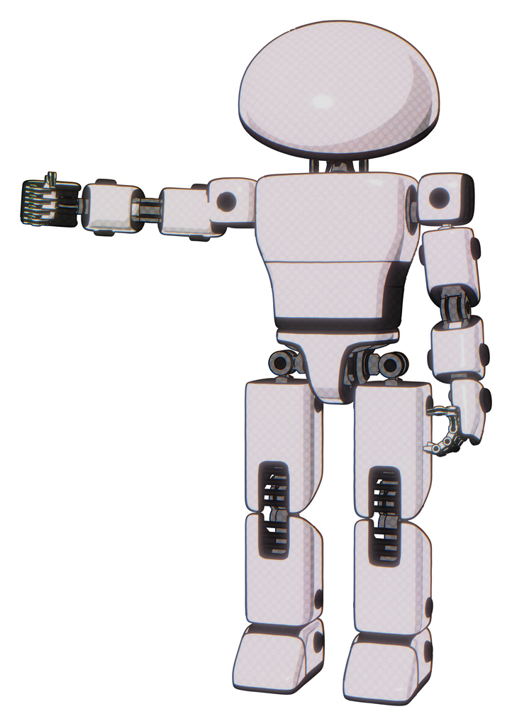 Mech containing dome head and light chest exoshielding and prototype exoplate chest and prototype exoplate legs. White halftone toon. Arm out holding invisible object..