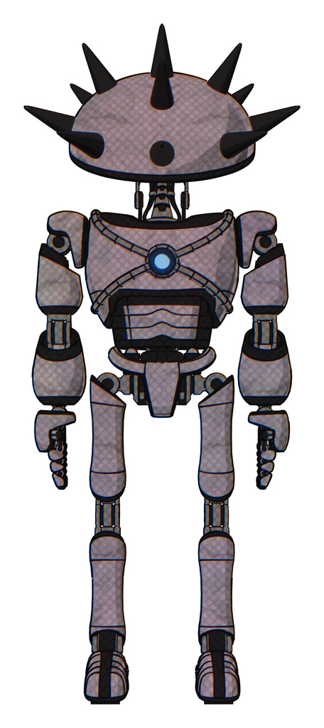 Automaton containing thorny domehead design and light chest exoshielding and blue energy core and ultralight foot exosuit. Dark sketch. Front view.
