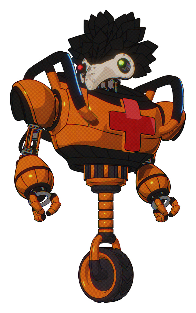 Droid containing bird skull head and yellow and green scope eyes and crow feather design and heavy upper chest and first aid chest symbol and blue strip lights and unicycle wheel.