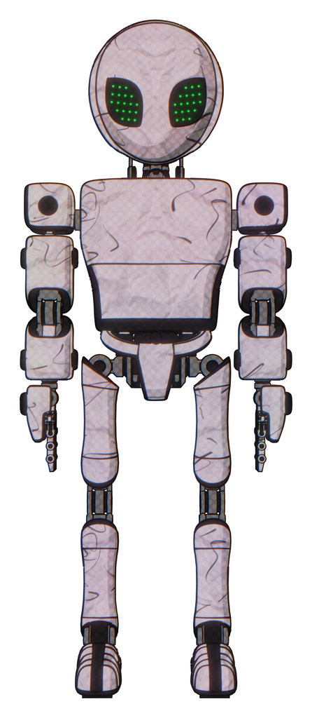Robot containing grey alien style head and led array eyes and light chest exoshielding and prototype exoplate chest and ultralight foot exosuit. Sketch pad doodle lines. Front view.
