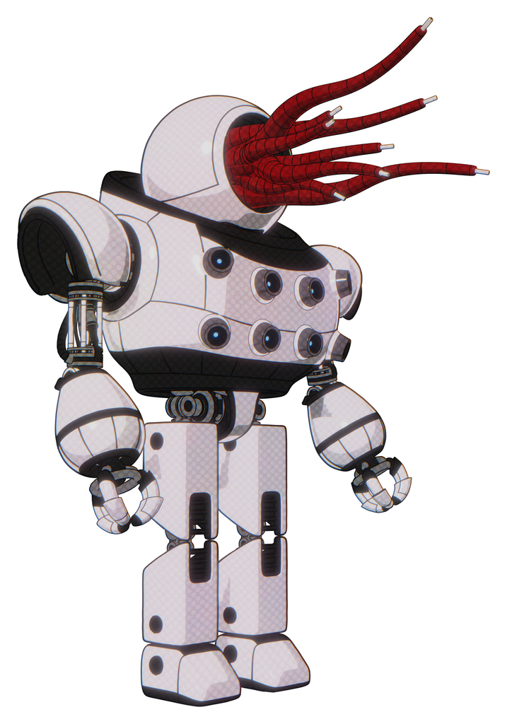 Bot containing jellyfish style head red fiber optic tentacles and heavy upper chest and chest energy sockets and prototype exoplate legs. White halftone toon. Facing left view.