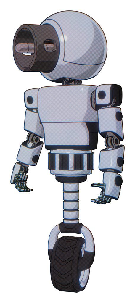Bot containing cable connector head and light chest exoshielding and prototype exoplate chest and unicycle wheel. Blue tint toon. Standing looking right restful pose.