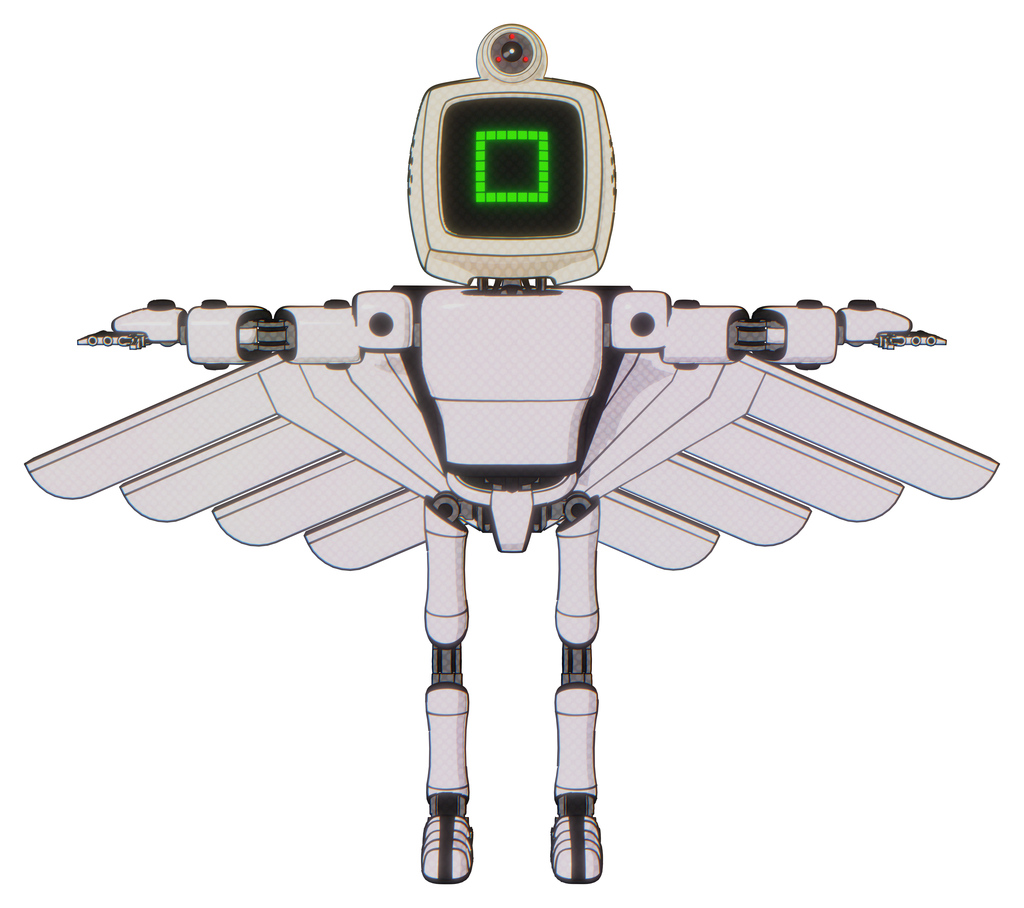 Droid containing elements: old computer monitor, pixel square design, retro-futuristic webcam, light chest exoshielding, prototype exoplate chest, pilot's wings assembly, ultralight foot exosuit.