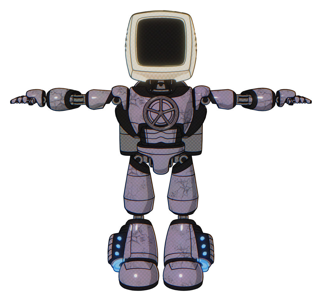 Automaton containing old computer monitor and light chest exoshielding and chest valve crank and rocket pack and light leg exoshielding and megneto-hovers foot mod. Matted pink metal. T-pose.