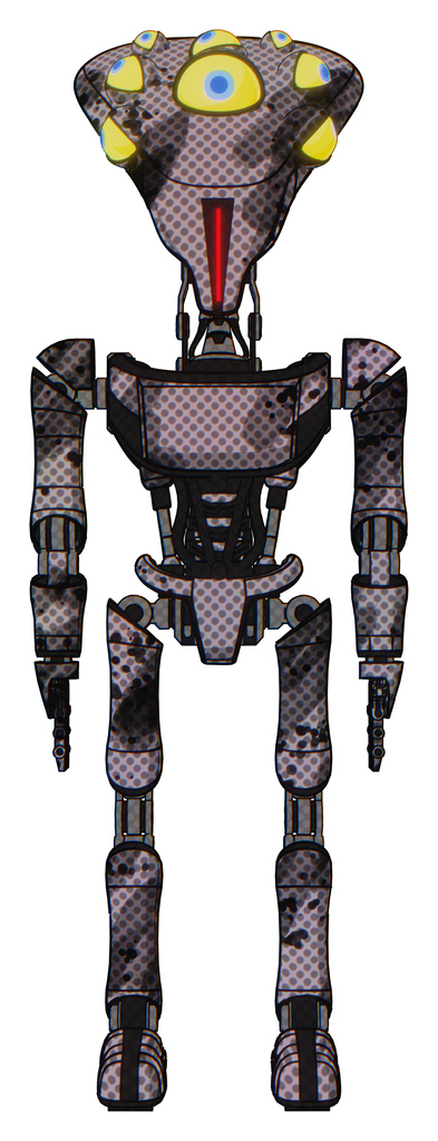 Mech containing flat elongated skull head and yellow eyeball array and light chest exoshielding and ultralight chest exosuit and ultralight foot exosuit. Smudgy sketch. Front view.