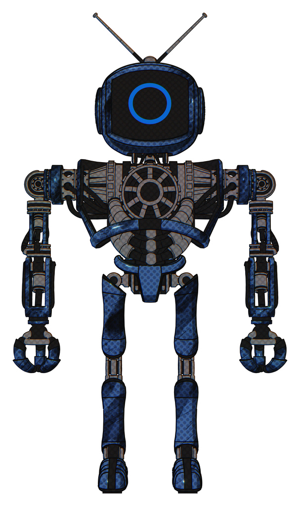 Automaton containing digital display head and circle face and retro antennas and heavy upper chest and no chest plating and ultralight foot exosuit. Grunge dark blue. Front view.
