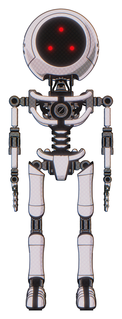 Automaton containing three led eyes round head and light chest exoshielding and no chest plating and ultralight foot exosuit. White halftone toon. Front view.