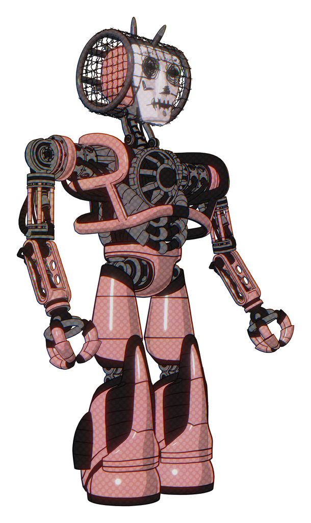 Mech containing humanoid face mask and skeleton war paint and heavy upper chest and no chest plating and light leg exoshielding and stomper foot mod. Toon pink tint. Facing left view.