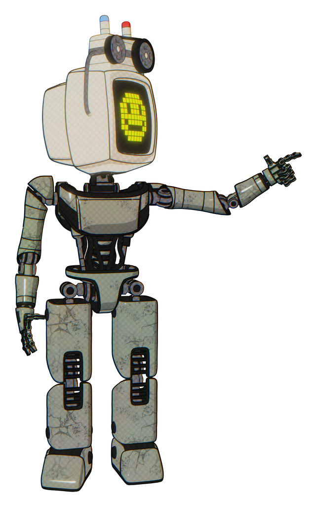 Robot containing old computer monitor and pixel design of yellow happy face and old computer magnetic tape and light chest exoshielding and ultralight chest exosuit and prototype exoplate legs.