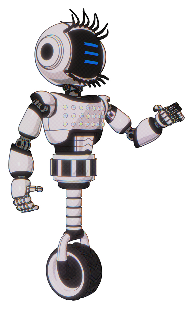 Mech containing elements: digital display head, three horizontal line design, eye lashes deco, light chest exoshielding, chest green blue lights array, unicycle wheel. Material: White halftone toon.