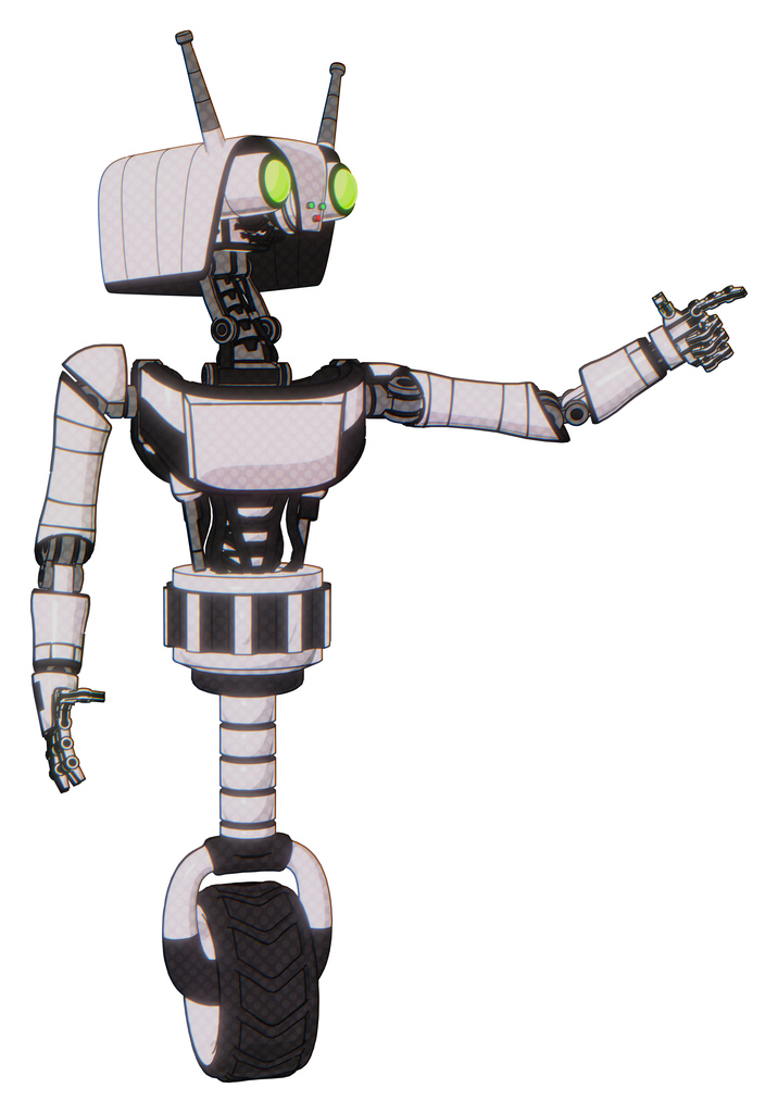 Bot containing dual retro camera head and cyborg antenna head and light chest exoshielding and ultralight chest exosuit and unicycle wheel. White halftone toon. Pointing left or pushing a button..