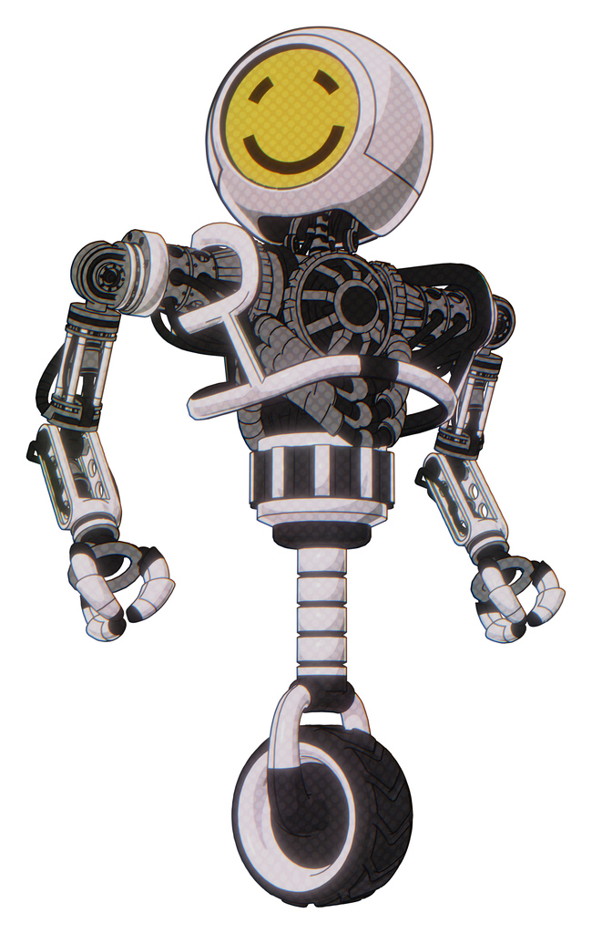 Cyborg containing round head yellow happy face and heavy upper chest and no chest plating and unicycle wheel. White halftone toon. Hero pose.