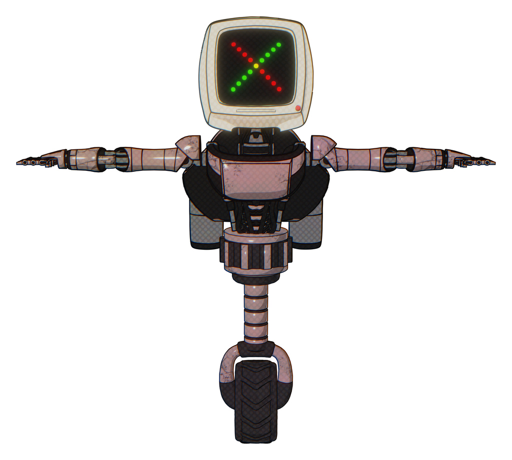 Automaton containing old computer monitor and colored x display and light chest exoshielding and ultralight chest exosuit and rocket pack and unicycle wheel. Powder pink metal. T-pose.