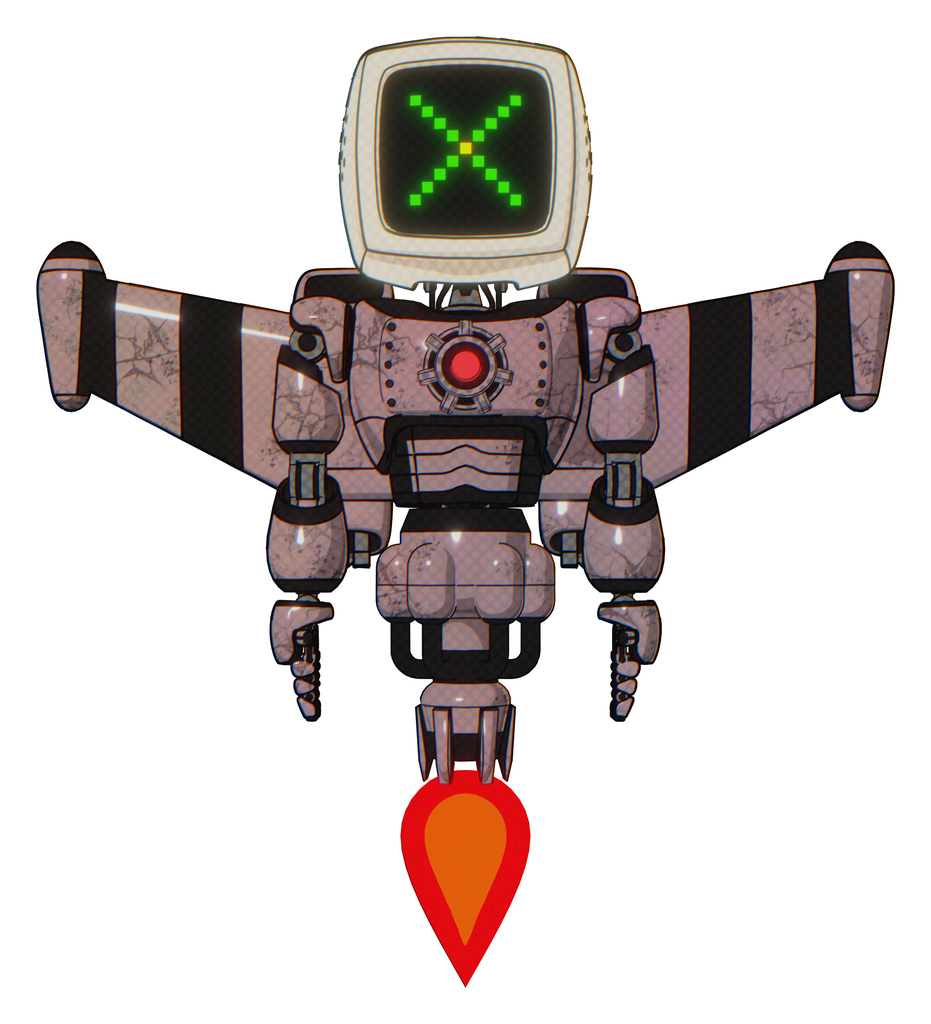 Mech containing elements: old computer monitor, pixel x, light chest exoshielding, red energy core, stellar jet wing rocket pack, jet propulsion. Material: Grayish pink. Situation: Front view.