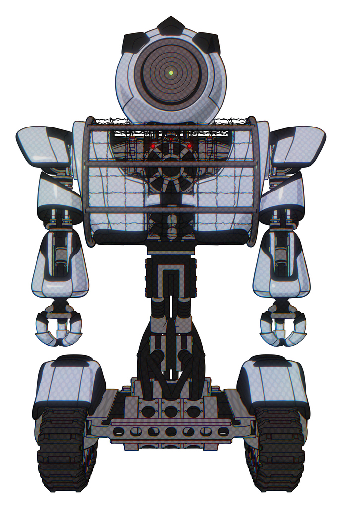 Automaton containing green dot eye corn row plastic hair and heavy upper chest and heavy mech chest and barbed wire chest armor cage and tank tracks. Blue tint toon. Front view.