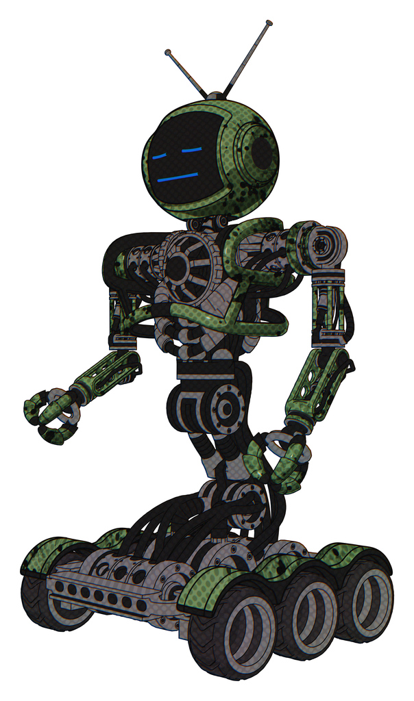Cyborg containing digital display head and sleeping face and retro antennas and heavy upper chest and no chest plating and six-wheeler base. Grunge grass green. Facing right view.