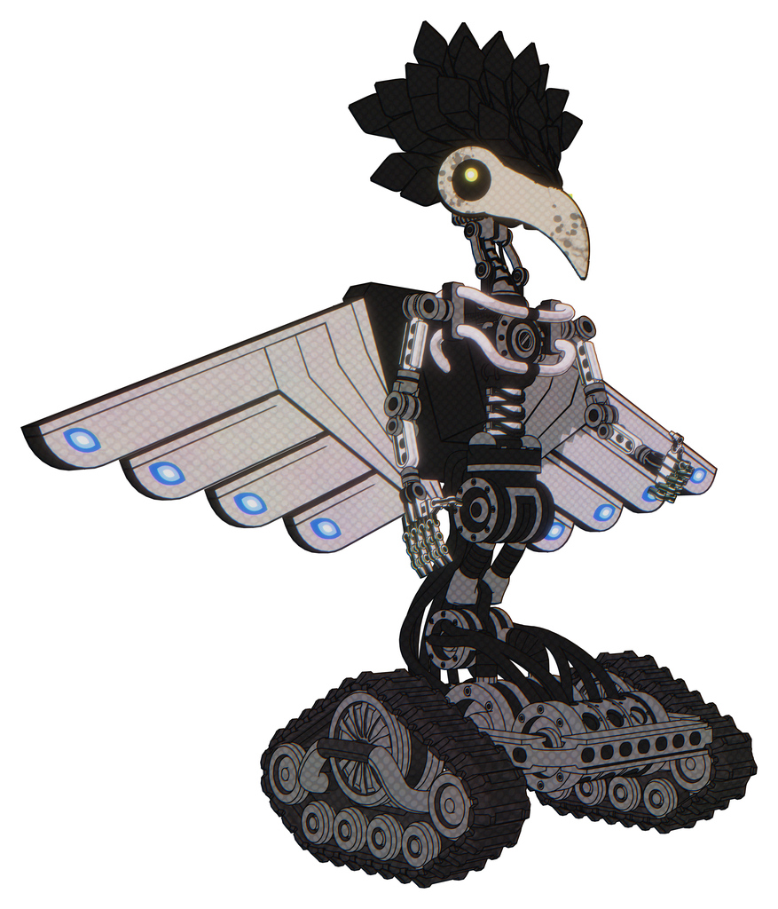Robot containing elements: bird skull head, yellow led protruding eyes, crow feather design, light chest exoshielding, cherub wings design, no chest plating, tank tracks.