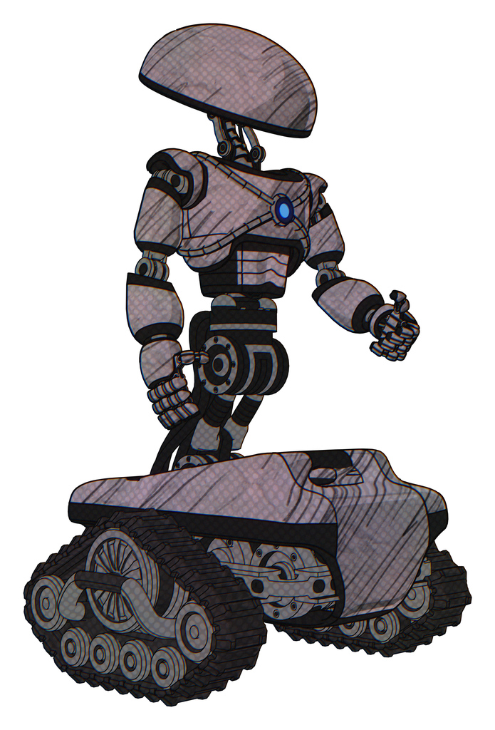 Automaton containing dome head and light chest exoshielding and blue energy core and tank tracks. Dark sketch lines. Facing left view.
