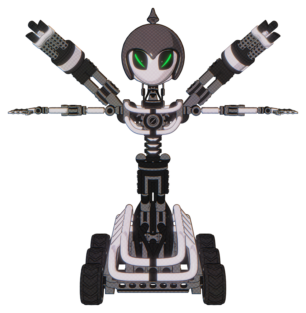 Cyborg containing grey alien style head and green demon eyes and gray helmet and light chest exoshielding and minigun back assembly and no chest plating and six-wheeler base. White halftone toon.