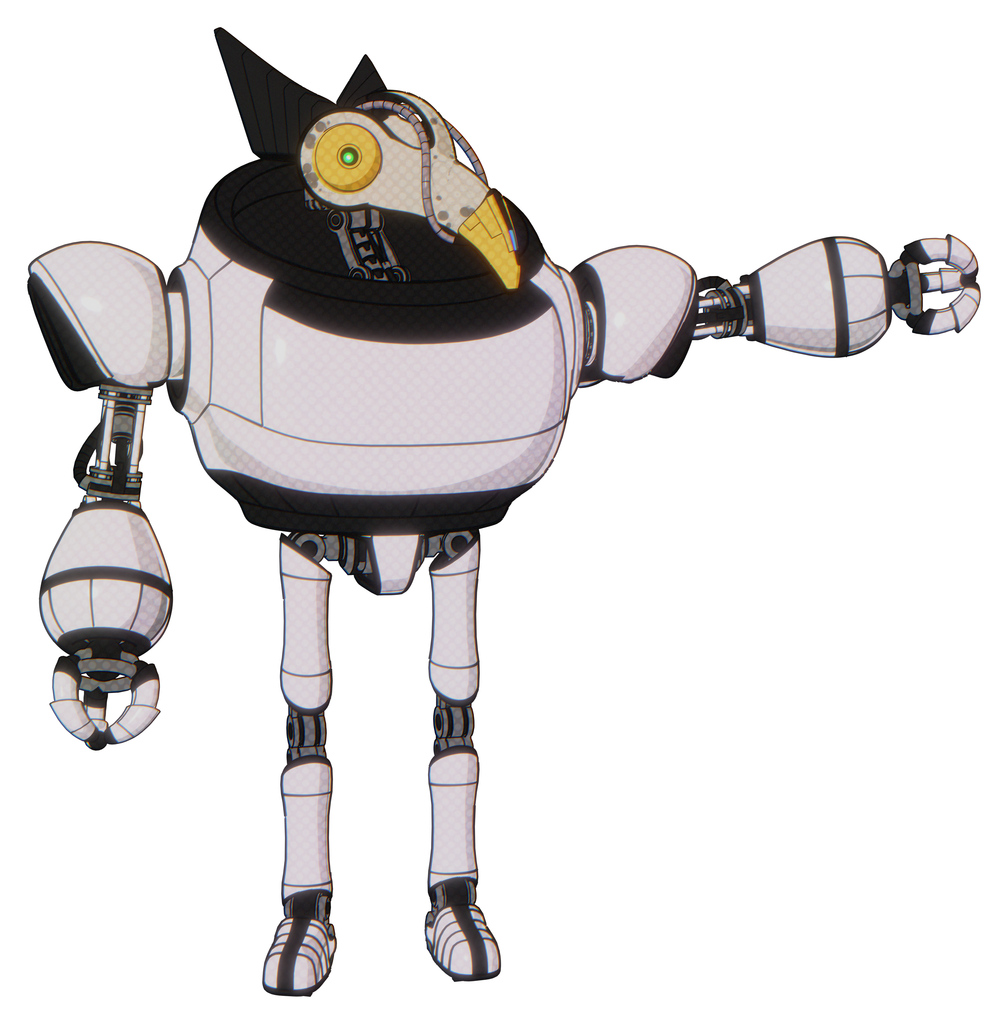 Bot containing bird skull head and brass steampunk eyes and robobeak design and heavy upper chest and ultralight foot exosuit. White halftone toon. Pointing left or pushing a button..