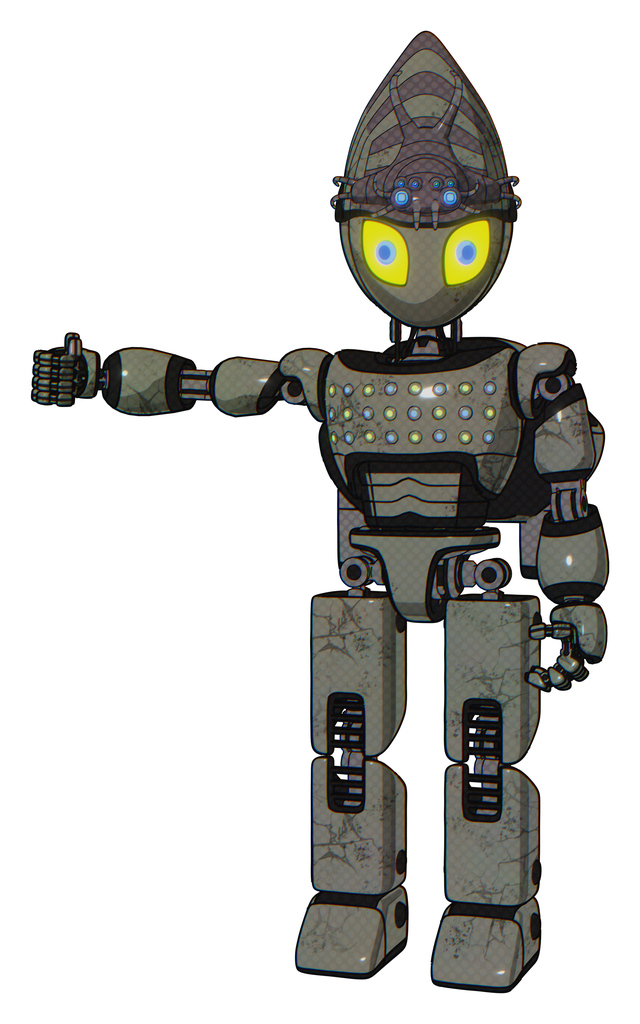Robot containing grey alien style head and yellow eyes with blue pupils and alien bug creature hat and light chest exoshielding and chest green blue lights array and rocket pack .
