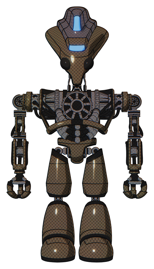 Droid containing flat elongated skull head and visor and heavy upper chest and no chest plating and light leg exoshielding. Light brown halftone. Front view.