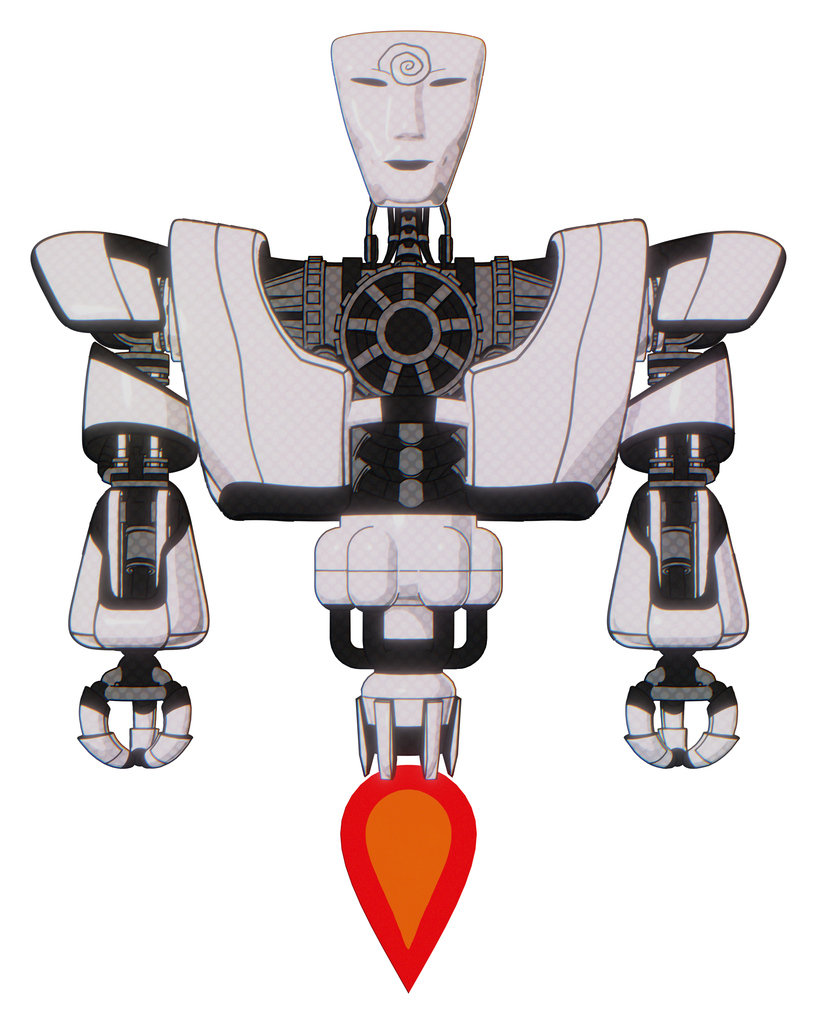 Mech containing humanoid face mask and spiral design and heavy upper chest and heavy mech chest and jet propulsion. White halftone toon. Front view.