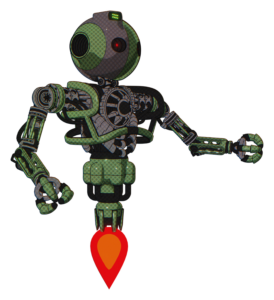 Cyborg containing oval wide head and small red led eyes and green led ornament and heavy upper chest and no chest plating and jet propulsion. Grass green. Interacting.