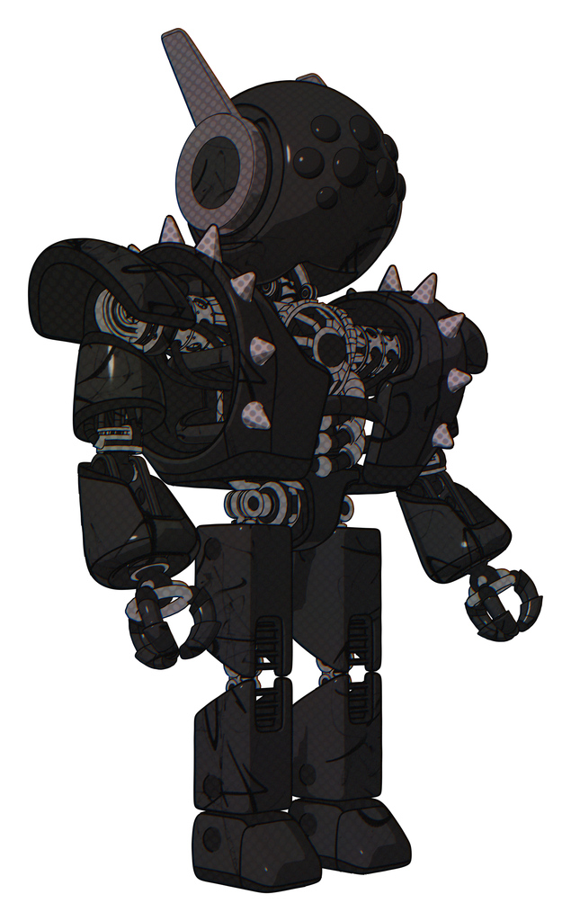 Mech containing round head and bug eye array and head winglets and heavy upper chest and heavy mech chest and shoulder spikes and prototype exoplate legs. Toon black scribbles sketch.